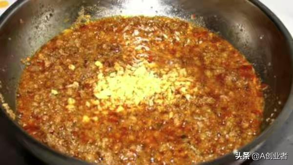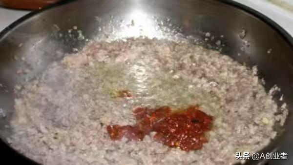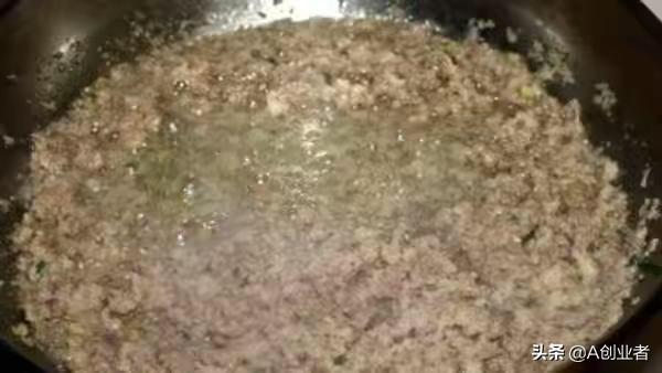 2、肉末炒变色后,炒出香味,用小火熬5分钟。