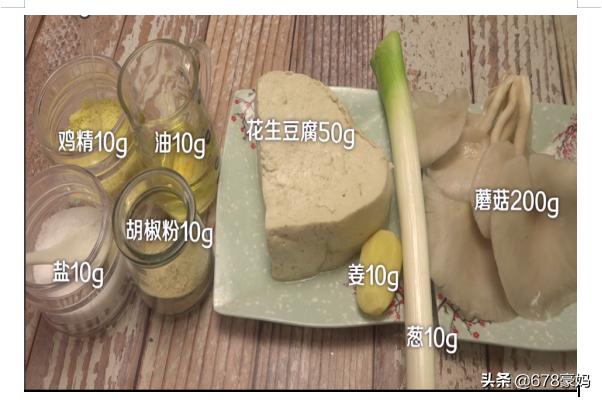 第一步,我们要先把食材准备好,需要准备好鸡精10g、油10g、盐10g、胡椒粉10g、花生、豆腐50g、姜10g、葱10g、蘑菇200g。