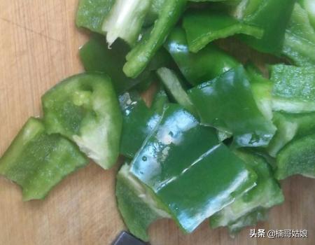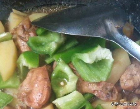 10、炖到土豆块快烂时,放入青椒,可以焖一下直熟,放一勺白糖。个人比较偏好炖到熟烂青椒。出锅前放点味精。