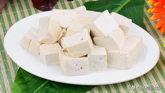 1、制豆腐:将黄豆用水泡发,泡好后用清水洗净,换入清水20~25kg,用石磨磨成稀糊,再加入与稀糊同样多的温水拌匀,装入布袋内,用力把浆汁挤出,再在豆渣内对入沸水拌匀后再挤,如此连续豆渣不沾手,豆浆已挤完时,撇去泡沫,将浆汁入锅用大火烧开,倒入缸内,加进石膏汁,边加边用木棍搅动,约搅15~20转后,可滴上少许水,如与浆混合,表示石膏汁不够,须再加进一些石膏汁再搅。如所滴入的水没有同浆混合,约过20min后即成为豆腐脑。将豆腐脑舀入木盒内,盖上木板,压上重石块,压去水分,即成豆腐。