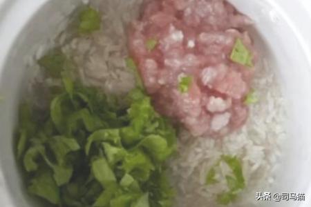 3、将瘦猪肉洗净,切成肉沫,在白粥熬成后,加入肉沫拌匀,等猪肉变色熟后,及少量的加入一点盐调味出锅,盛出后,滴入一两滴香油即成。