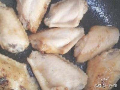 6、把鸡翅放入锅中,微微煎炸,煎至出颜色。