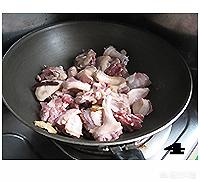 将鸭肉块炒至鸭皮收缩颜色变白,再调至中小火慢慢煸炒,直至将鸭油炒出。