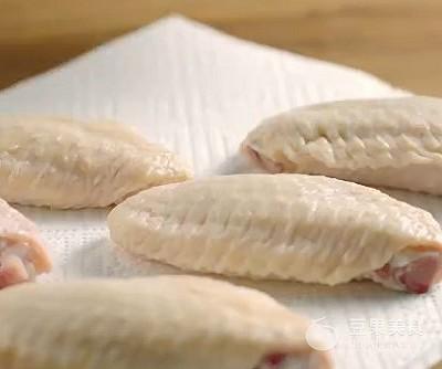 2、将洗净的鸡翅放在厨房纸巾上,吸干水分。