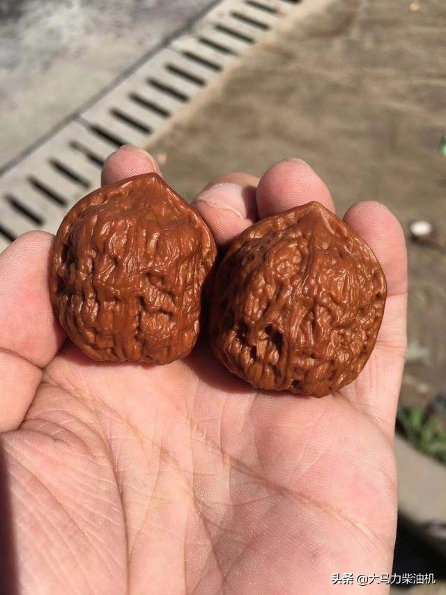 野生的将军膀,这种核桃一般呈偏方形,从顶部开使,肩向两个方向平行延伸出云,肩平肉阔,特别像军人的肩章,所以,叫将军膀,虽然,将军膀的形状奇特,但并非夹板夹出来的,而是天然生长,所以才会珍贵。这种核桃密度大,肉较厚,重点比较大,坠手。