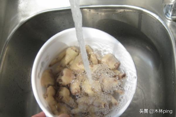 3、煮好后立刻捞出来,用凉水不停冲洗,直到凤爪凉透,表面的胶质物被冲洗干净。