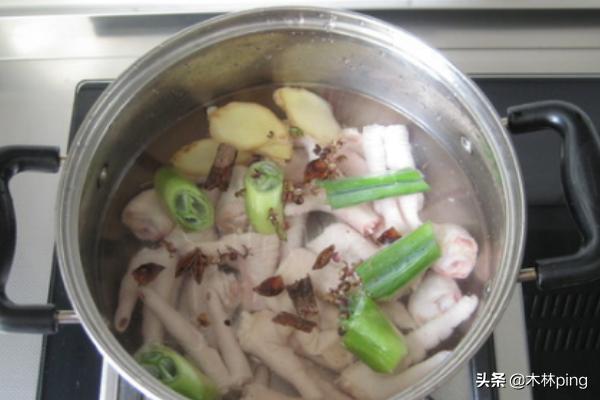 凤爪洗净去指甲对半切开。先在开水里氽过去腥气。换水,在水中放入葱姜片,黄酒,花椒,八角和适量盐,将凤爪放入,上火烧开,中小火闷煮15-20分钟。喜欢脆的就15分钟,喜欢口感软些的就20分钟。