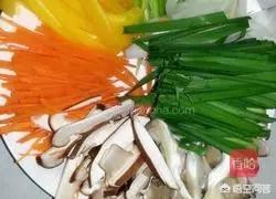 1.把香菇,胡萝卜,彩椒,青椒,洋葱,韭菜按一定长度切好
