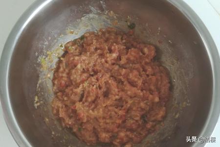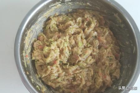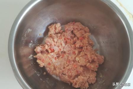 5、把西胡芦去皮洗净,用檫板檫成细丝,再攥去水份,放盆里。把攥去水份的西胡芦丝放入肉泥盆里,搅拌均匀制成西胡芦饺子馅。
