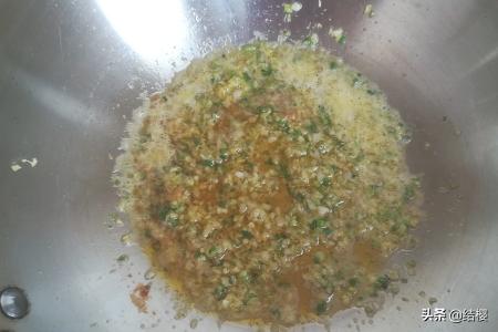 3、将炒锅放于灶上,开火,倒入适量胡油,等油五成熟时,将葱,姜,蒜末放入锅内,加适量盐煸香,制成葱油。