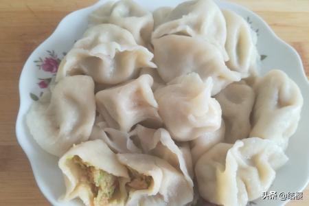 7、将煮锅里加多半锅水,再给锅里放入一根葱,开火,等水开了将饺子下入锅内,边下边用锅铲从底部慢慢的铲几下,直到把所有的饺子下完,盖上锅盖煮制。等饺子浮到水面上后,隔2分钟,给锅里加一勺凉水,等饺子煮的看着饱满了,就表明饺子煮熟了,用漏勺捞出放在盘子里,这样西胡芦馅饺子就做好了,又能饱餐一顿了,好香啊!