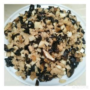 4、锅里放少许油,猪肉碎放下去炒熟,下一点点酱油调色,装盘。锅里放少许油,将笋丁放下去翻炒几下,装盘。锅里放少许油,放进虾米、香菇、木耳,翻炒几下。将炒好的猪肉末、笋丁倒进锅里一起翻炒。下适量的盐。炒好装盘备用。