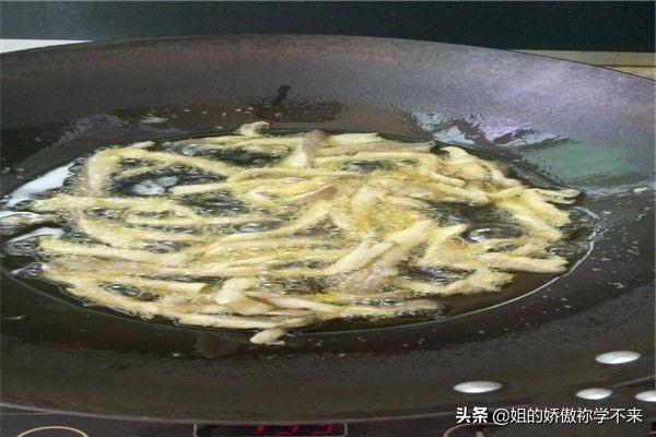 3、起锅烧油,待油温80度,将搅拌好的蘑菇一条一条下入油锅炸至金黄色捞出。