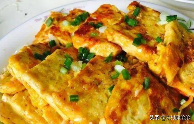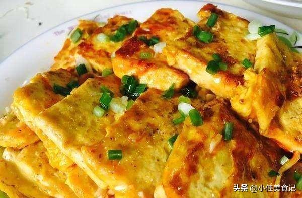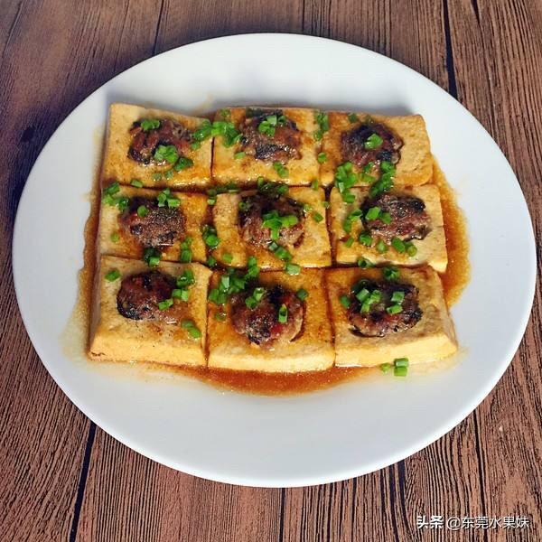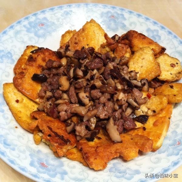 3.第三道菜豆腐做个干煎豆腐,把豆腐切成长方形滤干水分放进锅里小火煎到两面微微焦黄然后拿出锅,锅里在放油炒点瘦肉沫再放入刚才煎好的豆腐加清水加上适量的酱油耗油一起炖到清水收汁,出锅的时候撒点葱花进去增加香味的同时又可以加点配色。