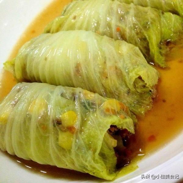 这第三道就是白菜卷猪肉,新鲜的白菜叶卷上酱过得猪肉末上笼屉一蒸,浇上调制的糖醋汁,那味道怎一个爽字了得。
