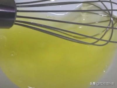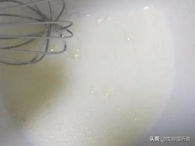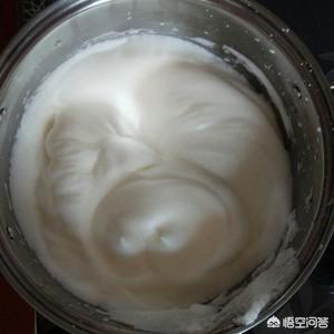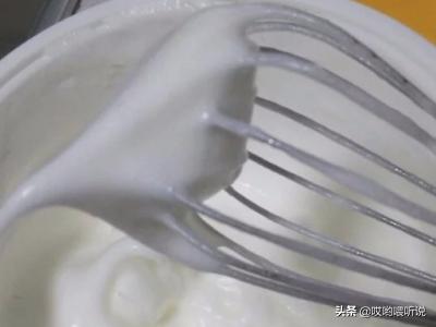 用打蛋器将蛋清打到奶油状、加一点点盐、中途分三次加三勺糖。打到能提起一个尖