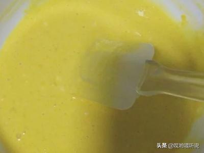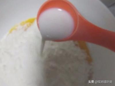 蛋黄里加3勺糖、六勺面粉、10~11勺牛奶(也可以是奶茶、酸奶什么的)、将它们混合到没有面粉粒。