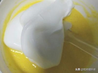 将蛋清分两次倒入蛋黄里、用上下法和匀、不能打圈。