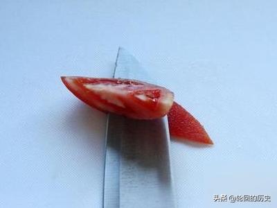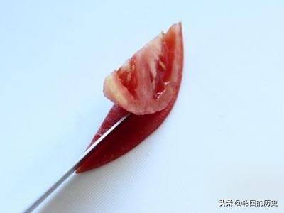 10、还可以切成比较小的造型。西红柿切成半圆厚片,用刀将皮和肉批开,但不能批断。