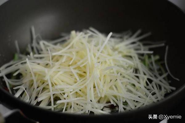 4、放入土豆丝,大火翻炒,淋入一汤匙白醋,炒匀。