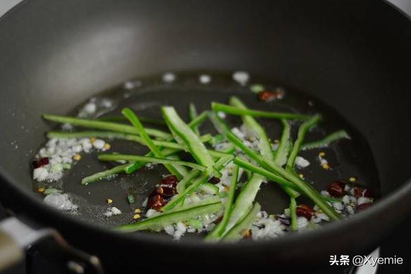 3、锅里倒入少许油,爆香葱白、干辣椒和蒜沫,放入青椒翻炒。