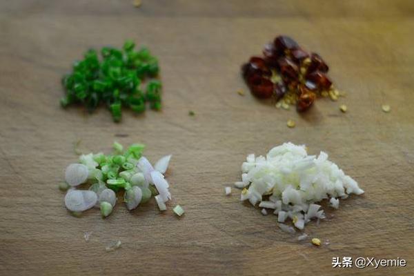 2、青椒切丝,葱白葱绿分别切末,干辣椒切段,蒜切碎沫。