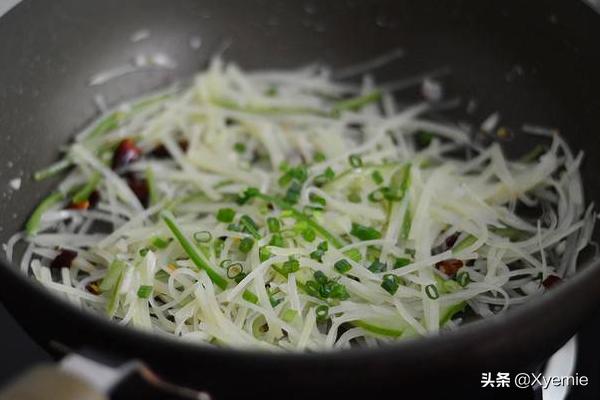 4、倒入食用油,放入葱花,倒入土豆丝。