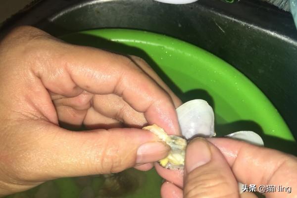 2挤掉花甲排泄物。煮开后放入盆中冷却,冷却后重复洗2遍,然后去掉花甲排泄物。注意不要用冷水冷哦,肉会缩小的。