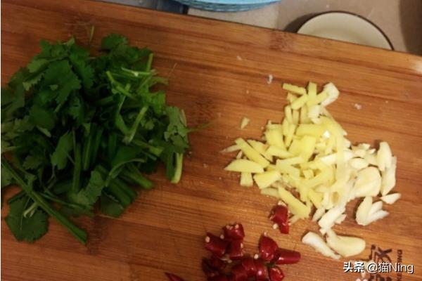 3备料。准备好要用的辅料,姜蒜,葱香菜,辣椒切小段备用。