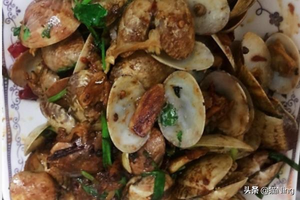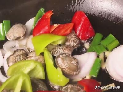 4翻炒。锅底多放些油,烧热,放入姜蒜辣椒,炸香,再放入花甲爆炒,翻炒几遍再放入料酒,酱油,耗油,豆瓣酱,翻炒均匀。注意加少量水微煮,可保持花甲水分哦。