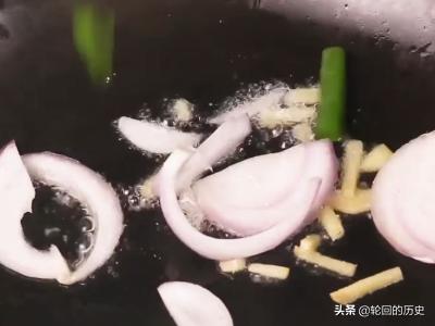 2、热锅冷油,下入大蒜,生姜,小葱,洋葱炒出香味。