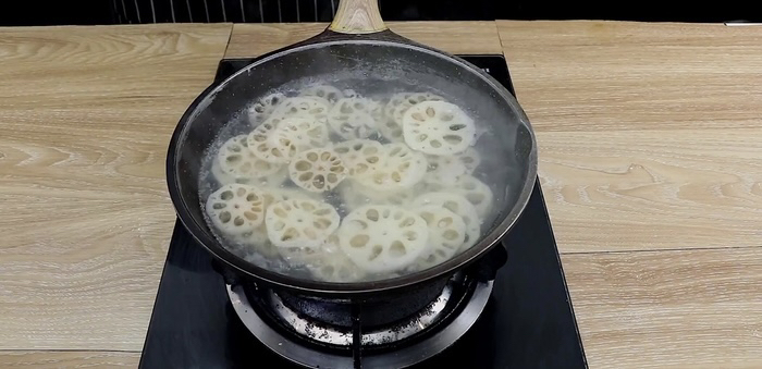 首先起锅倒水,水开放入1片白醋、藕焯水3分钟捞出沥干水分备用。