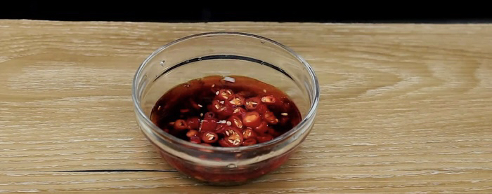 然后碗中放入蒜、1勺陈醋、1勺生抽、适量盐、3克白糖、适量辣椒油、少许香油、小米辣拌成料汁。