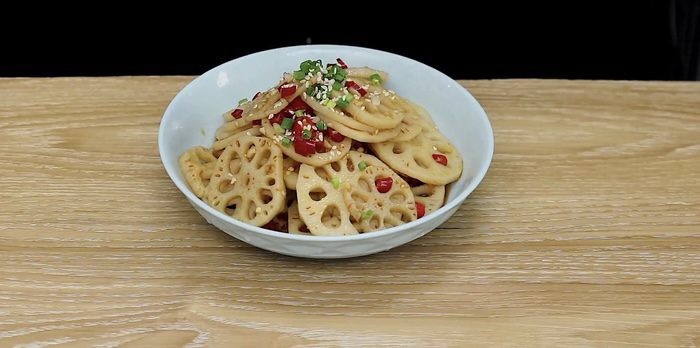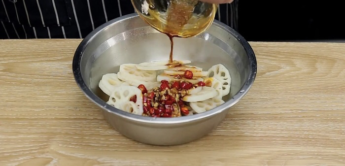 接着盆中倒入莲藕、料汁拌匀。