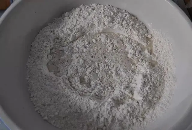 2.将面粉倒入面盆,中间扒个坑。将化开的酵母粉连水一块倒入面中,然后将剩余的水也倒进去!如果面粉较干,面团硬的揉不动,你可以适当多加上几十克的水。