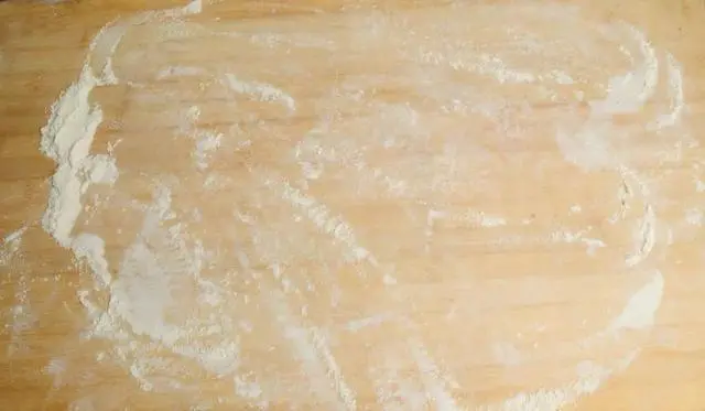 5.揉面排气:先将面板上撒些干面粉,手上也沾些干面粉,然后将面团从面盆取出放到面板上,这样不至于面团粘住面板和手。