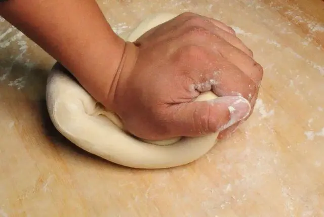 3.用手将面粉和水拌匀,然后用力将全部原料揉成均匀光滑的面团。反复多揉几次,你就能揉出:面净、手净、盆净这“三净”的面团来。