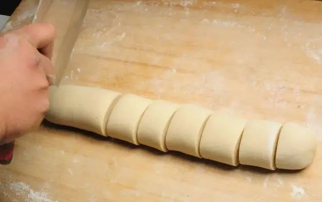 8.然后用刀均匀切开,切的时候掌握三个字的要领:快、准、狠!这样切出的馒头才能均匀和形状的好看!