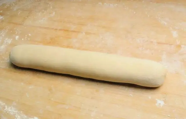 7.面团揉好以后,用手将面团搓成手腕状粗细的长条。