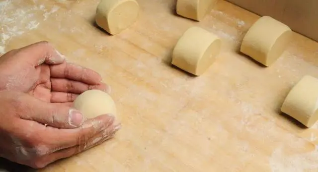 11.如果你要做圆圆的馒头,那么继续把切好的面团搓成圆团,然后找个最光滑的一面放在上面,把面团放在案板上,用手捧着来回搓,搓至全部变圆,底部小些上面大些的馒头状。