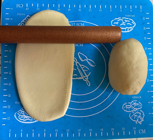 面团分成两部分(三部分也行,随你喜欢),用擀面杖压扁一点(使后续压面更方便)