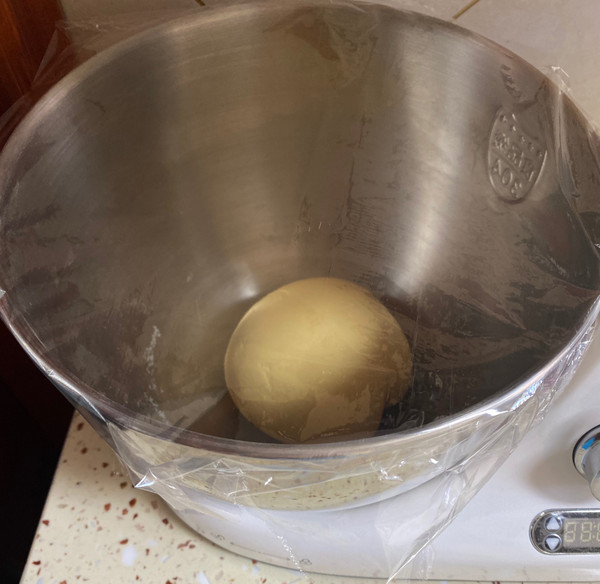 揉成较光滑的面团后,放入容器,盖上保鲜膜醒半小时。