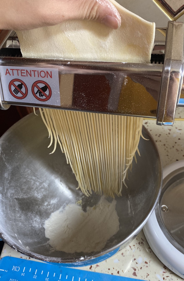 切面机 切面。撒上多一些的面粉,防止粘连。