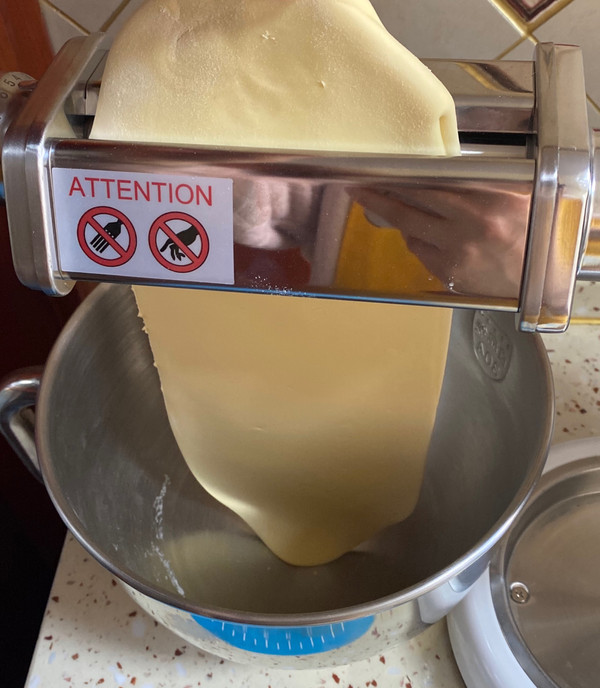 表面抹上面粉,然后进行压面。先选8档压两次,再逐渐减档压6次左右,直到压出的面片表面光滑平整。
