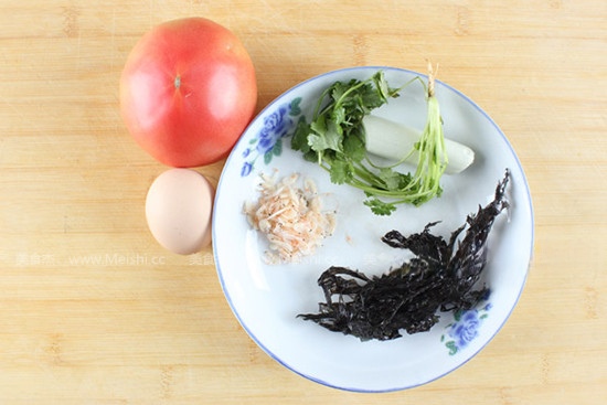 准备好紫菜10克,鸡蛋1个,西红柿50克 虾皮10克 香油10ml 醋4滴 胡椒粉5克 香菜30克 大葱10克 水500ml 食盐5克