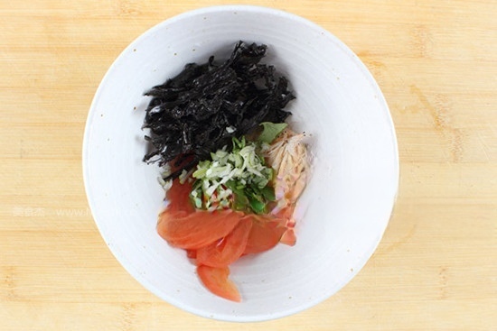 西红柿切5薄片,10克紫菜撕开,和10克虾皮一起放碗中,10克葱和10克香菜切末放碗中,然后放5克食盐、3克胡椒粉、3ml香油和4滴醋