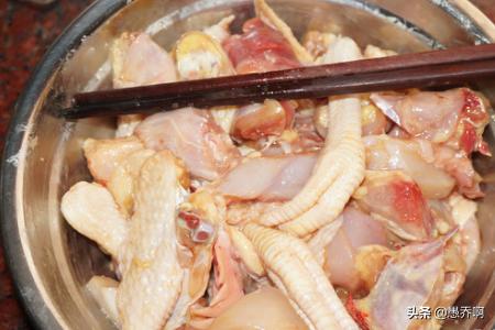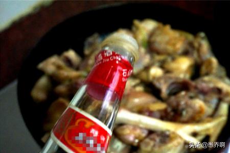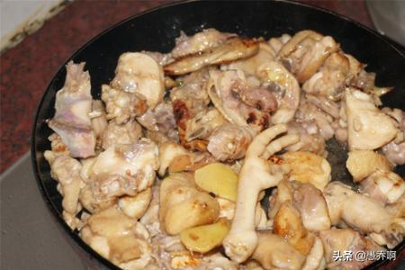 9、鸡肉炒至五成熟时加入1大勺米酒。