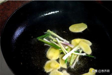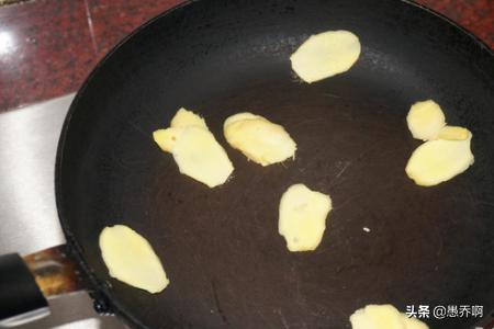 6、热锅,放入姜片炒香。这个叫白锅炒姜,先不要放油哦。