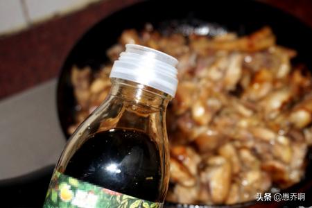 11、鸡肉炒至大概9成熟时再淋上少许酱油增香。