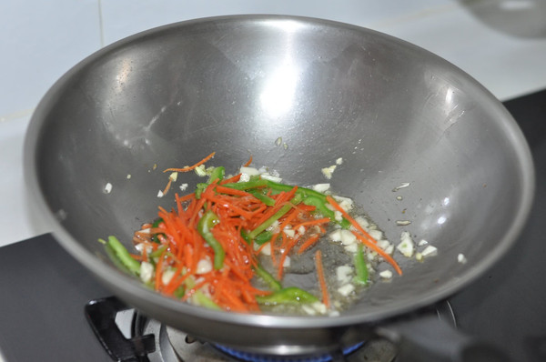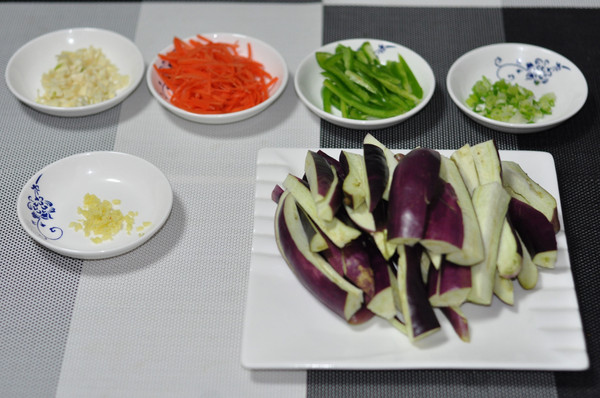 茄子切条,胡萝卜切丝,青椒切丝,葱姜蒜切末。调鱼香汁:酱油,醋,白糖,香油,水,淀粉调成汁备用。